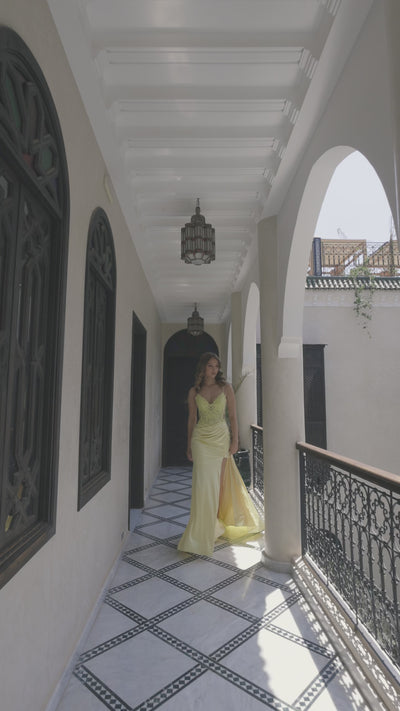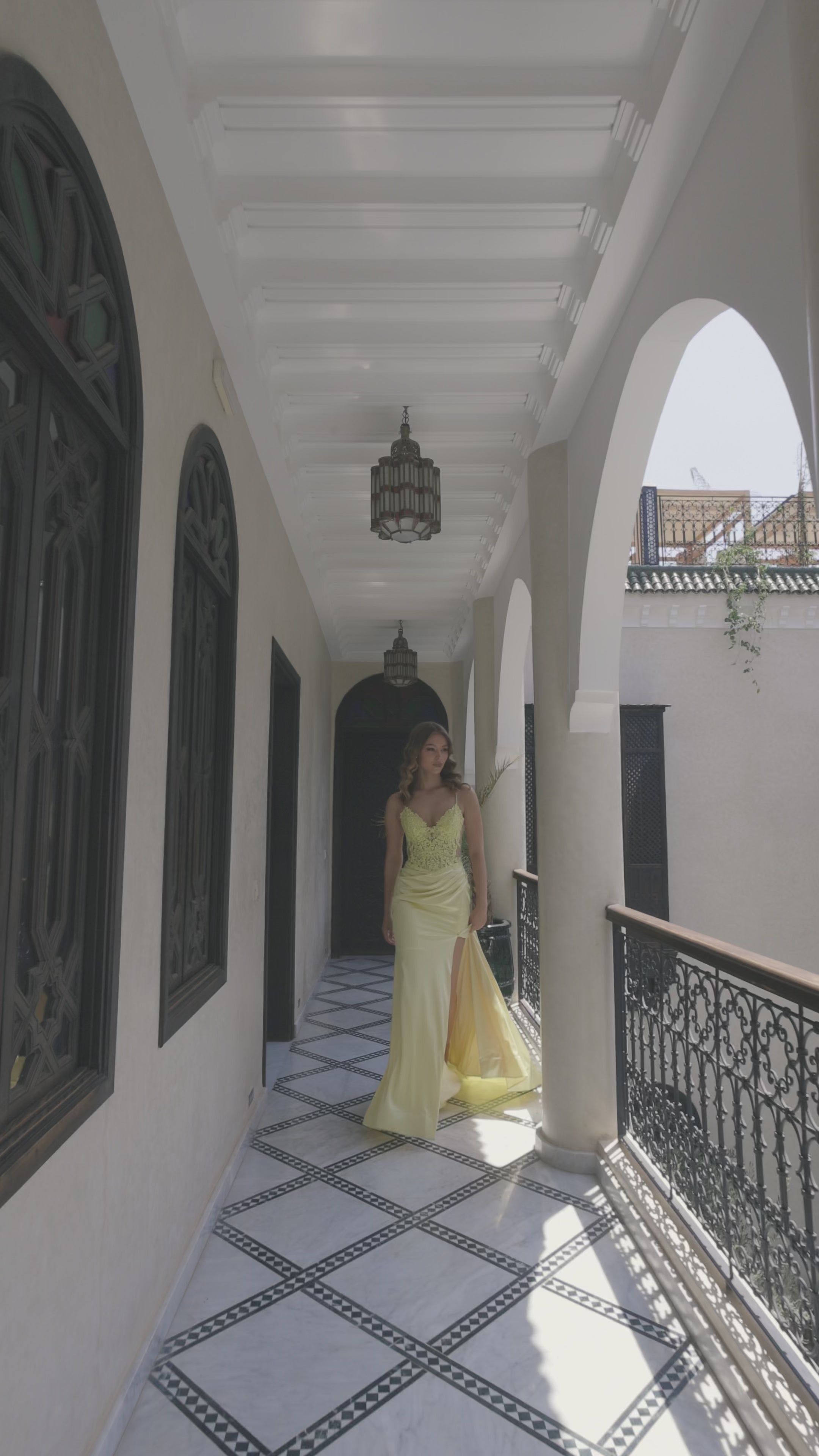New for 2026 is this tight fit prom dress with an appliqué lace top and delicate beaded strap detail. A low back and lemon, light pink and navy colour ways complete this look. Great for all sizes from petit to Jo curvy.
