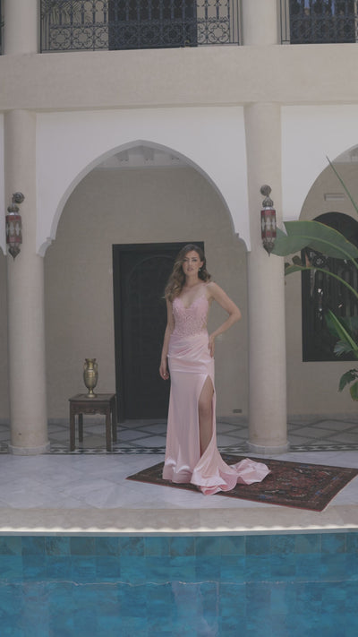 New for 2026 is this tight fit prom dress with an appliqué lace top and delicate beaded strap detail. A low back and lemon, light pink and navy colour ways complete this look. Great for all sizes from petit to Jo curvy.
