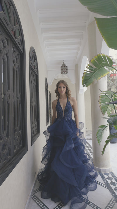 Gorgeous halter neck lace top with beads and sequins on a waterfall ruffle hem skirt in Swiss dot tulle. This navy prom dress is one that’s already a best seller for prom 2026. We love the full ruffle hem and halter neck combination.