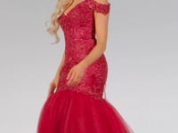 Gorgeous metallic lace sweetheart neckline with small drop shoulder details. Lace to thigh with full soft net mermaid skirt. We love the rose gold and the wine.