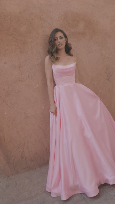 The it dress for Prom 2026 this strapless pastel corset satin Ballgown is the one to get in early on. We love the pockets and drape detail on the neckline.