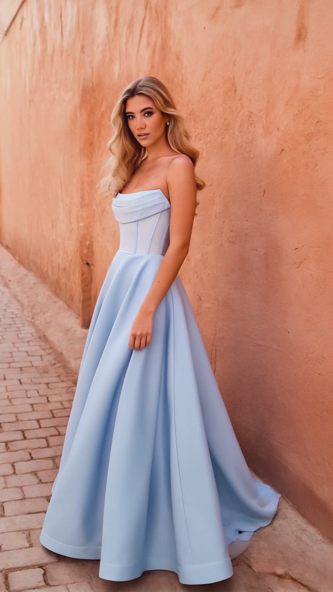 The it dress for Prom 2026 this strapless pastel corset satin Ballgown is the one to get in early on. We love the pockets and drape detail on the neckline.