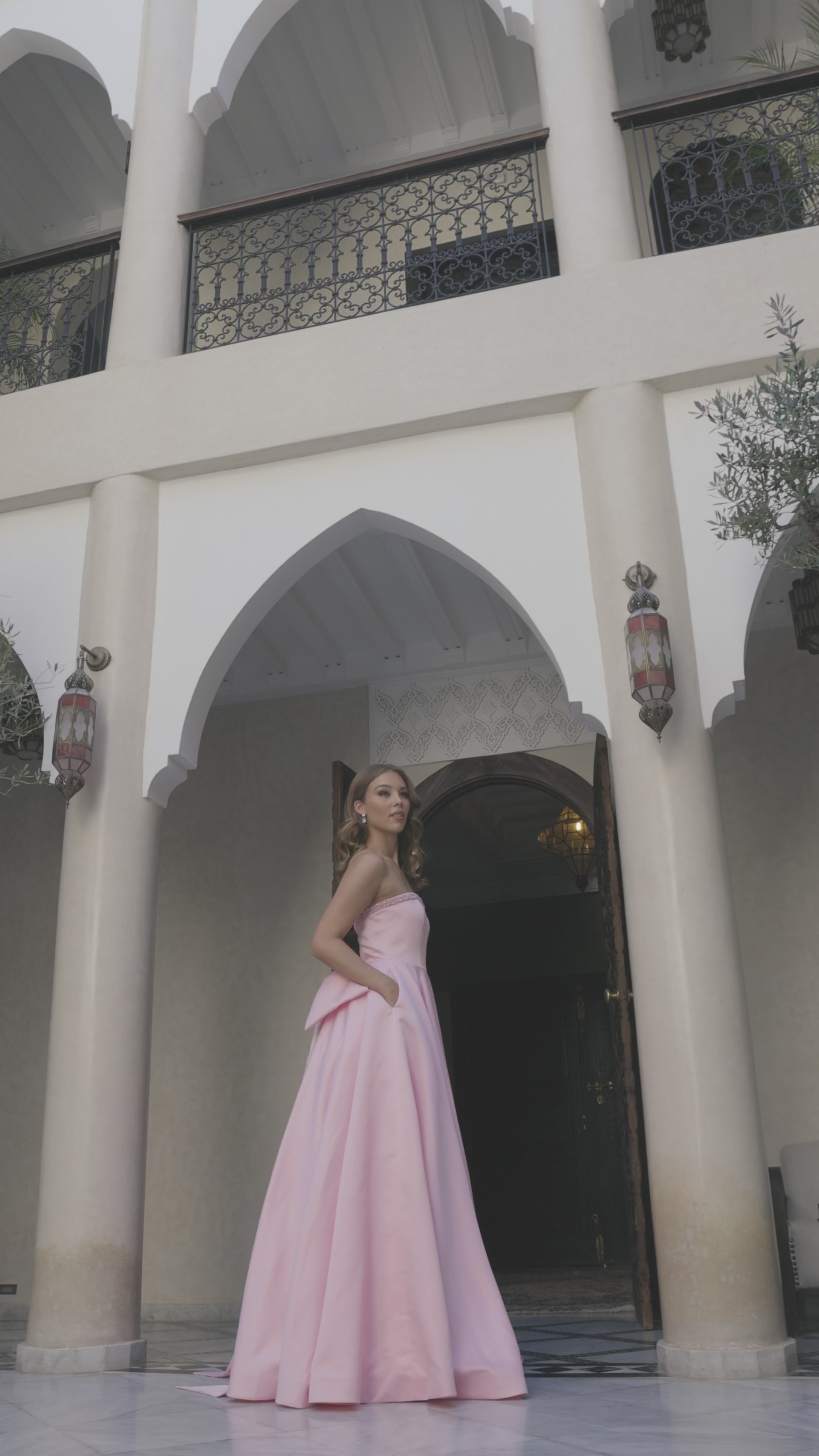 It’s all about the back bow with this stunning strapless satin ballgown with pearl neck detail. We love the huge bow with long tails on the back. Great choice for Prom 2026 or any red carpet event.