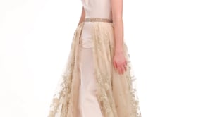 OMG!! Prepare to be dazzled by this amazing number. Wow!! Heavyweight satin racer style halter neck with beaded waist and straight satin column to floor. Showstopper organza appliqued lace overskirt. You will be the Belle of the Ball. We absolutely love the Nude.